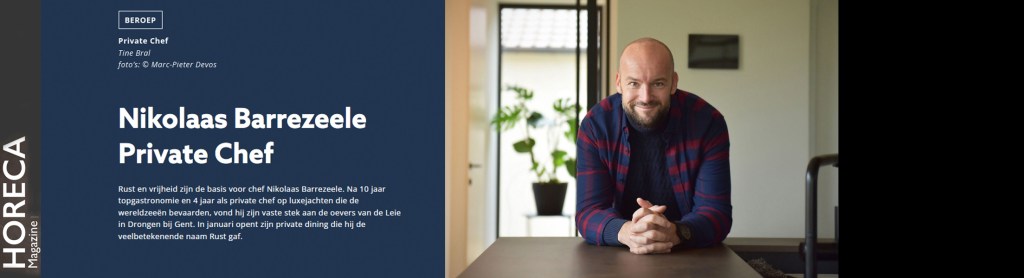Horeca Magazine l januari 2023 l BEROEP l Nikolaas Barrezeele. Private Chef Rust Private Dining l editor Horeca Magazine l tekst Tine Bral l foto’s Marc-Pieter Devos